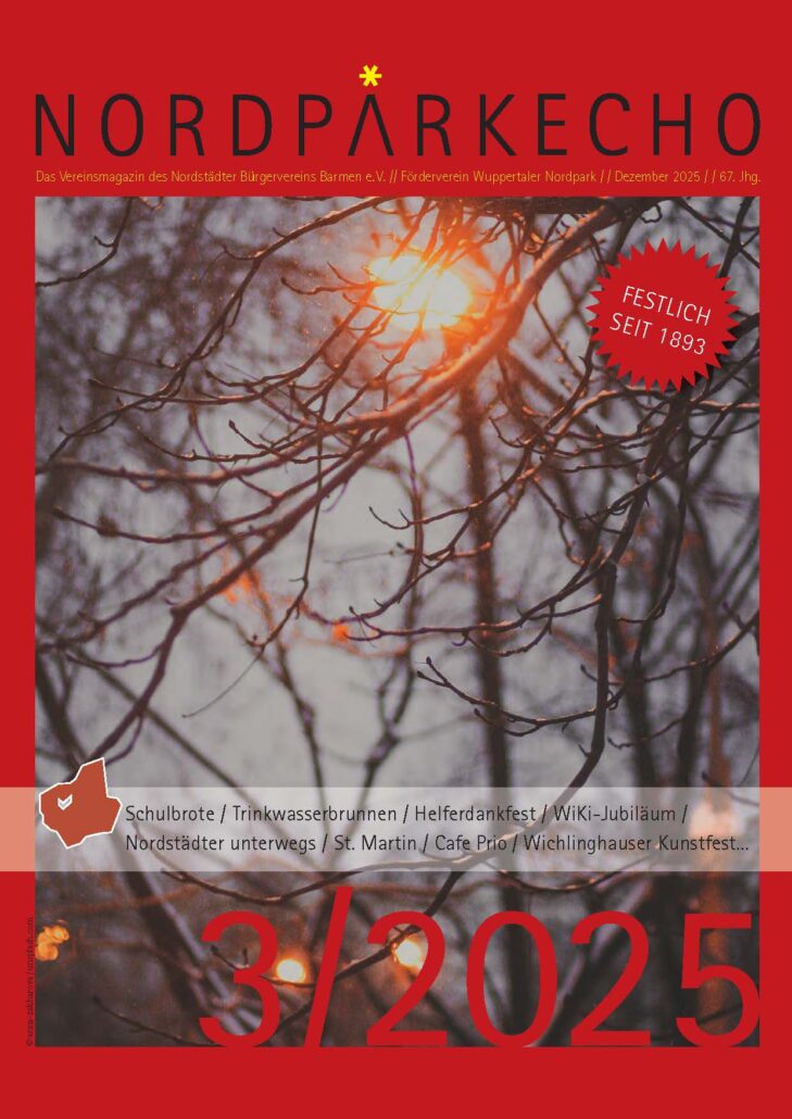 Der Nordstädter Bürgerverein Barmen freut sich darauf, Sie willkommen zu heißen und gemeinsam mit Ihnen die Zukunft zu gestalten. Von der Märkischen Straße im Westen bis hin zur Schwarzbach im Osten, sowie von der Talsohle im Süden bis zur Wasserscheide im Norden entlang der Straßen Einern bzw. Mollenkotten, fühlen wir uns verantwortlich.